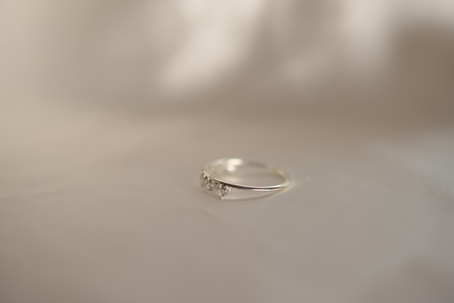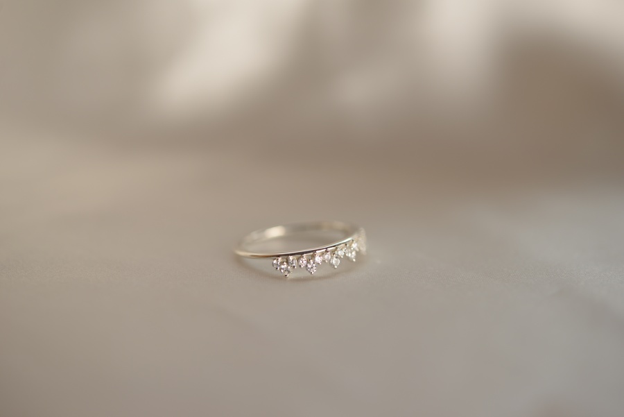 サイズの異なるダイヤを組み合わせることで、光の反射に奥行きが生まれ、一粒は小さくても全体ではしっかりとした存在感に。指先でふと動くたびに、ダイヤの粒がきらめきを重ね、美しい表情を見せてくれます。