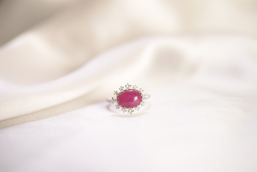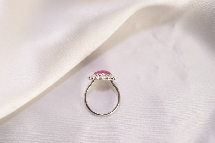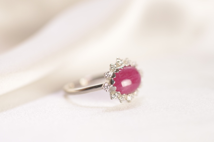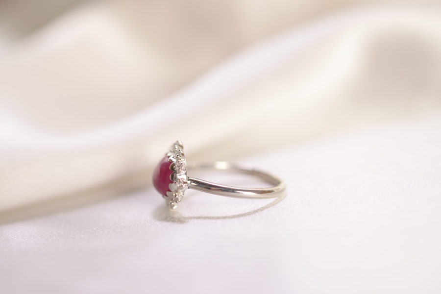 カボションルビーを、軽やかな取り巻きリングに